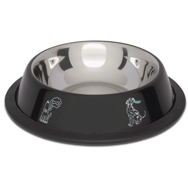 Miska wykonana ze stali chromowanej, na pokarm lub wodę dla psa. Łatwa do utrzymania czystości. Miska z obudową w kolorze czarnym i psim motywem.