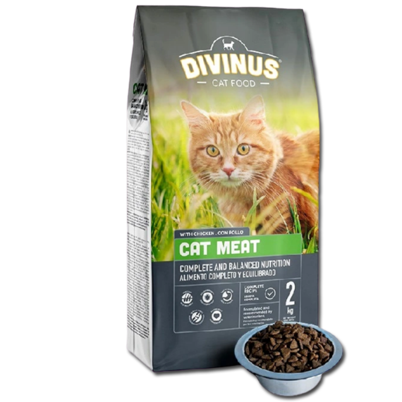 Divinus Cat Meat to pełnowartościowa sucha karma stworzona z myślą o dorosłych kotach wszystkich ras. Dzięki dużej zawartości mięsa i produktów odzwierzęcych, w tym min. 4% kurczaka, karma wyróżnia się wysoką smakowitością, która przypadnie do gustu nawet wybrednym kotom.